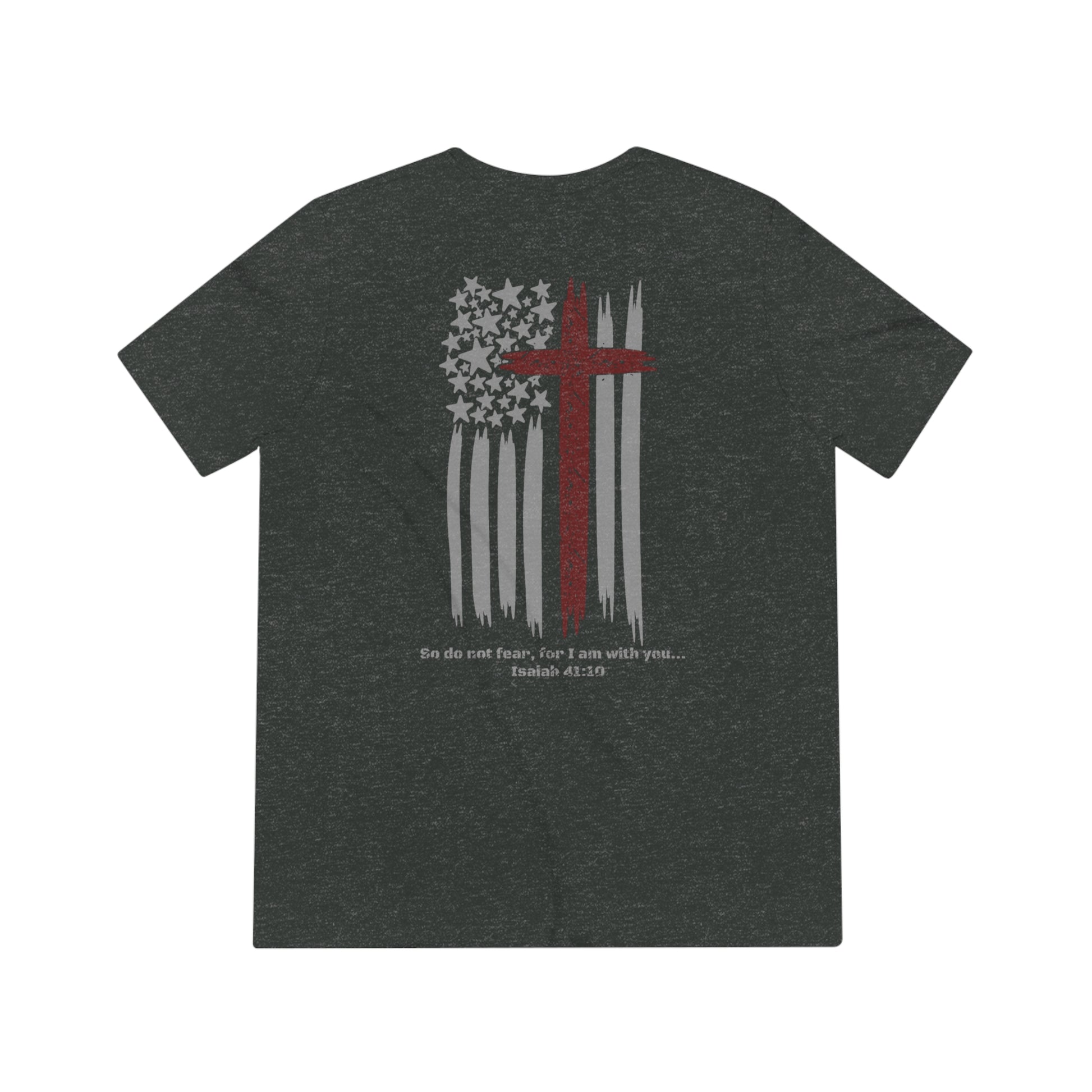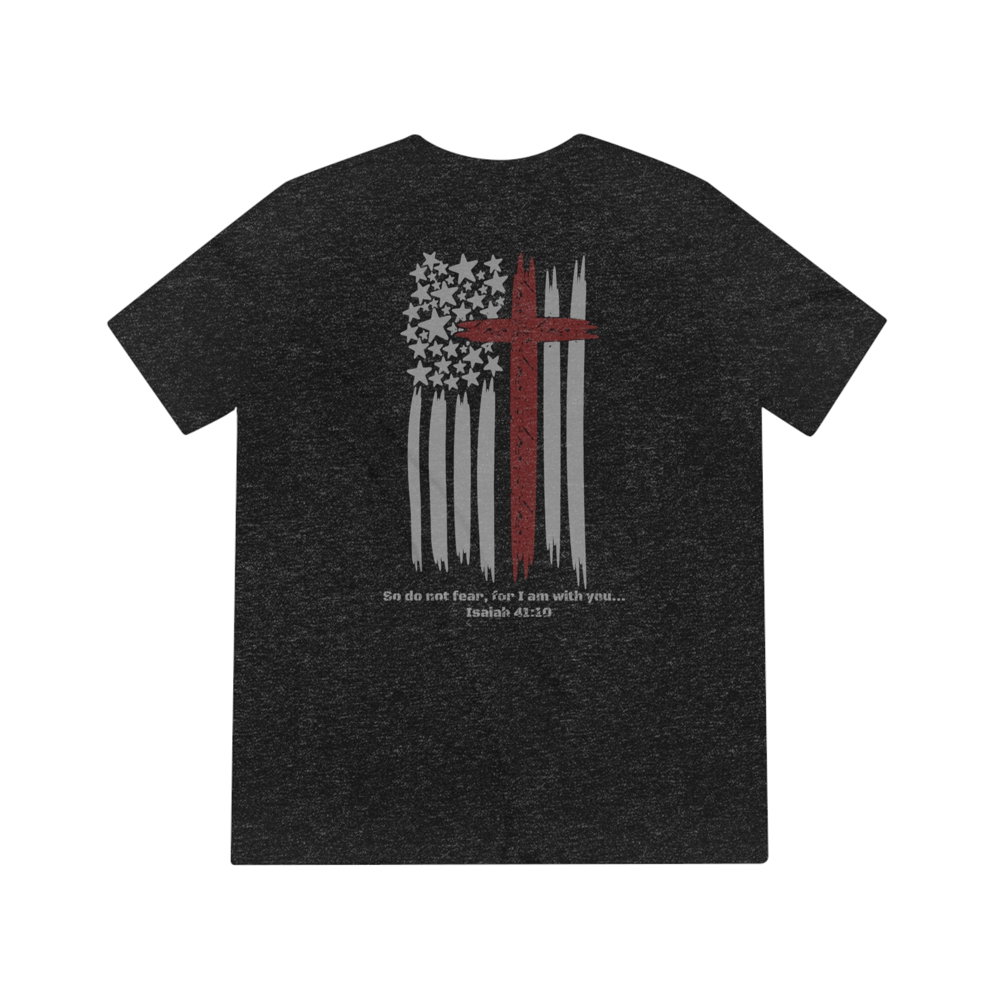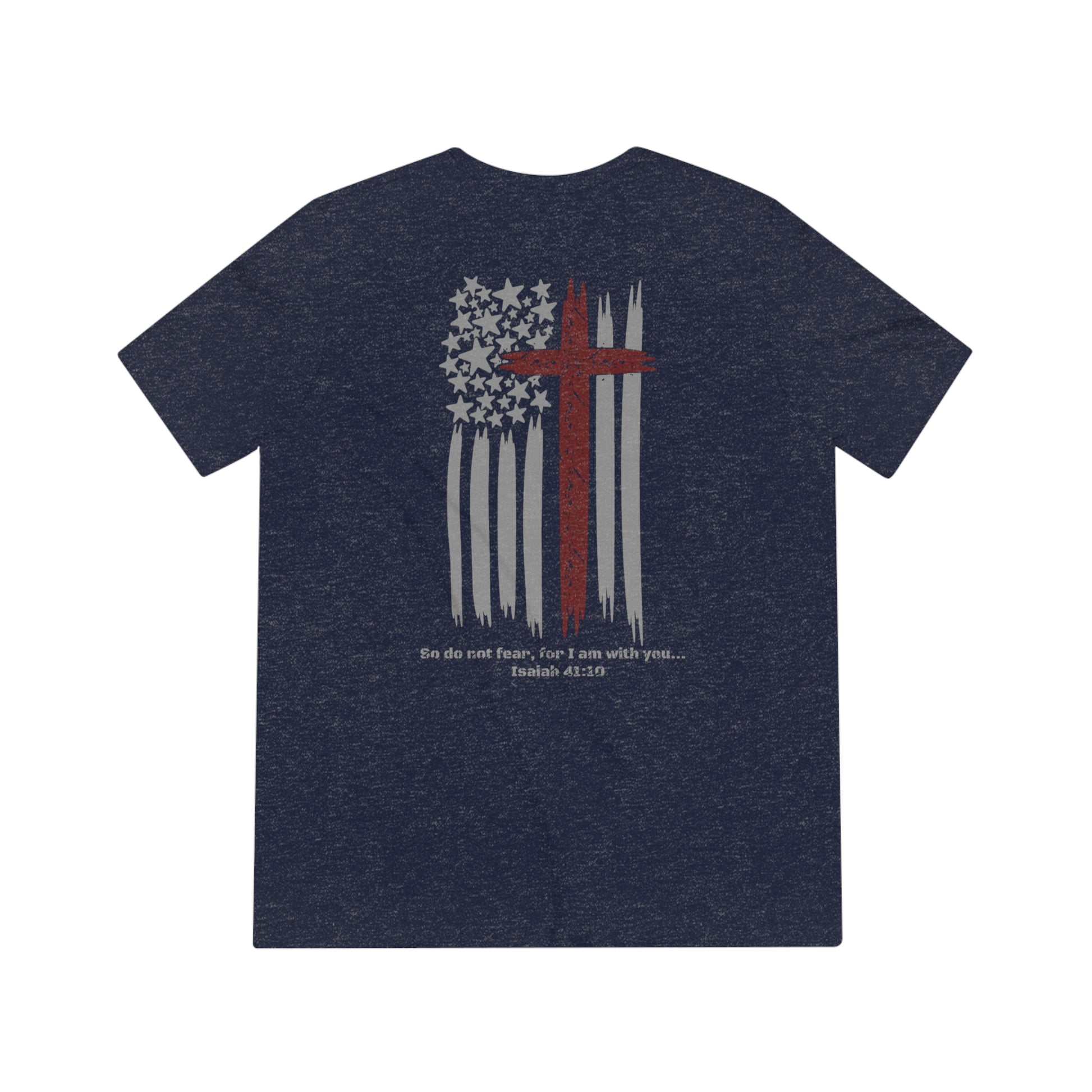 Crafted from high-quality, durable fabric in dark navy or charcoal gray, this shirt is as tough as the heroes who wear it. The front features the bold statement 'Fear Not,' while the back showcases a striking cross with a distressed American flag and the Bible verse.