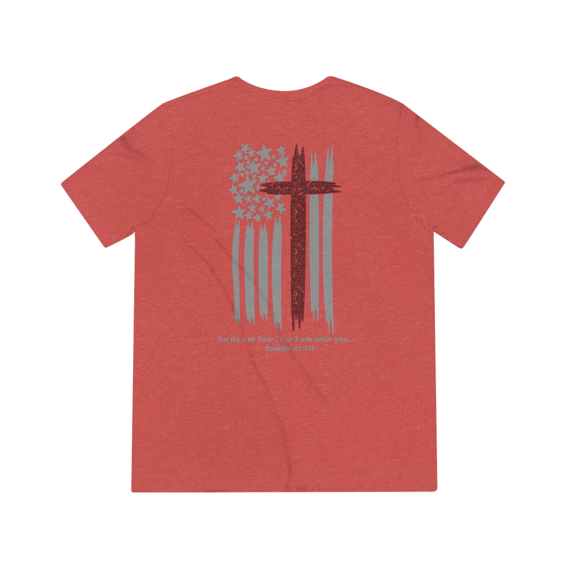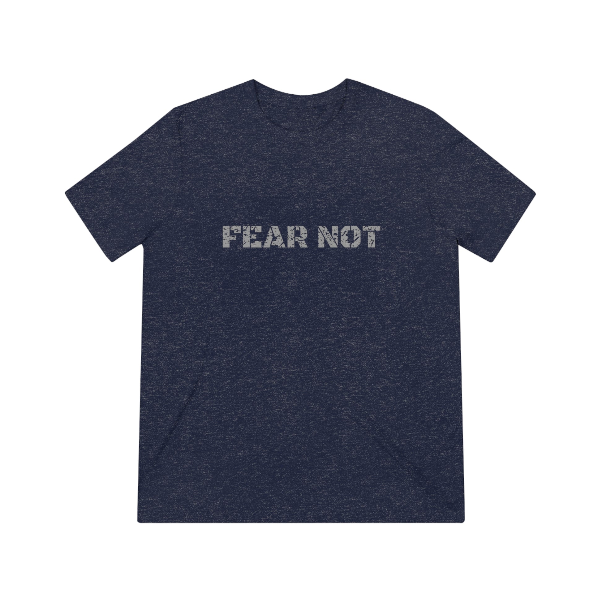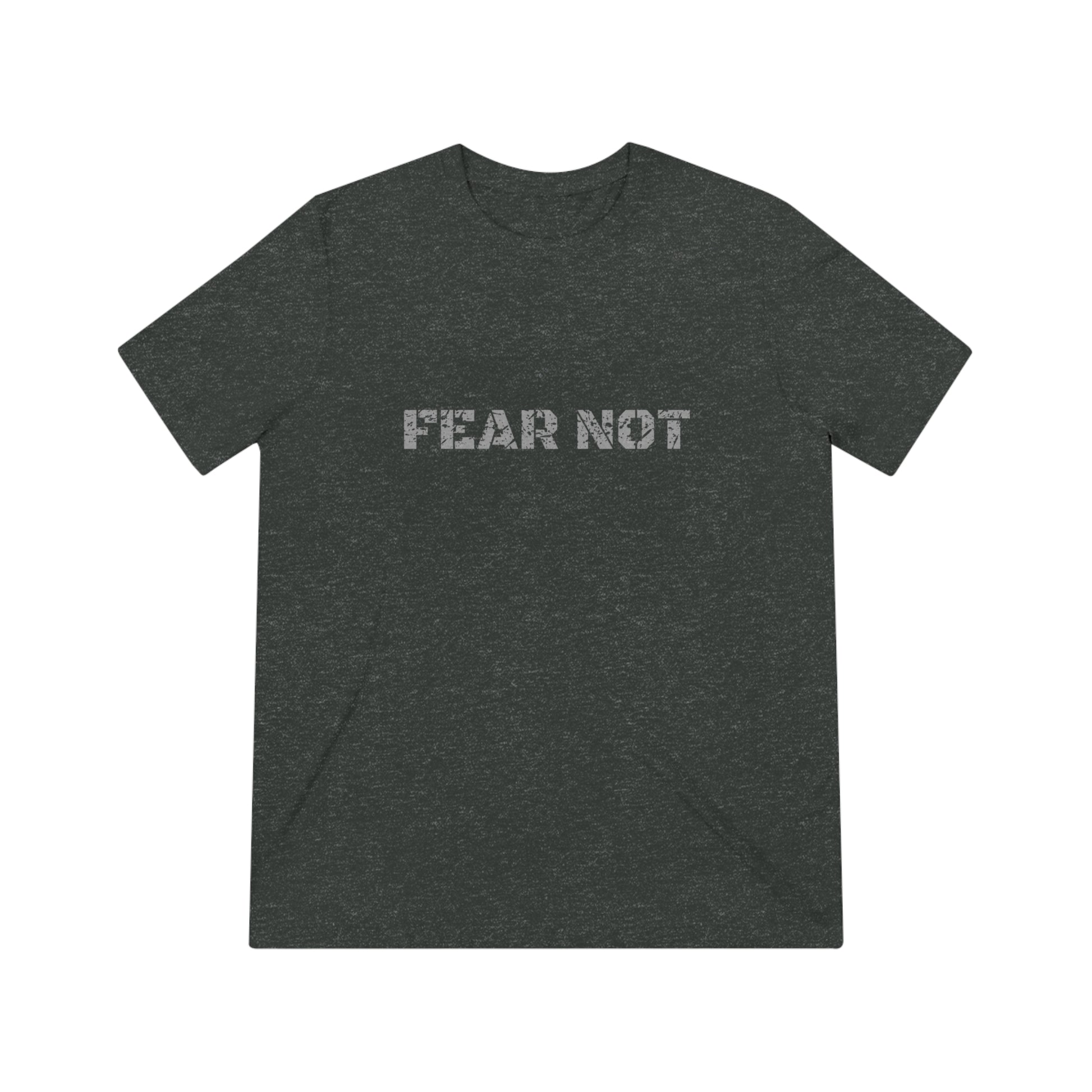 Crafted from high-quality, durable fabric in dark navy or charcoal gray, this shirt is as tough as the heroes who wear it. The front features the bold statement 'Fear Not,' while the back showcases a striking cross with a distressed American flag and the Bible verse.