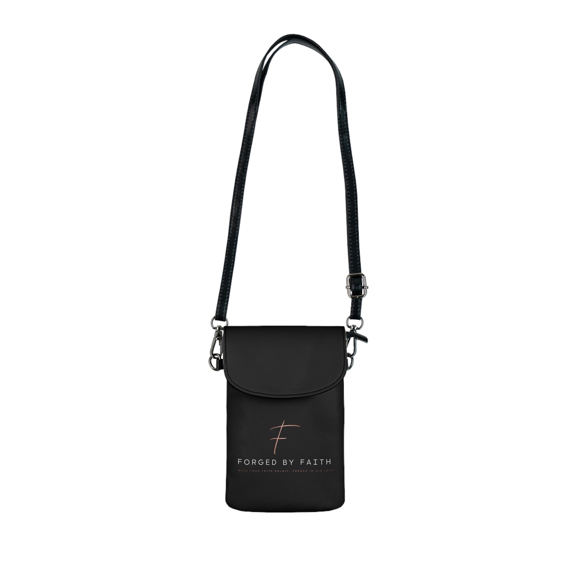This cell phone wallet features two main flip-up compartments—one for your phone and three hidden slots for regular-sized cards. The extendable faux leather strap, adjustable from 29.6" to 51.2" (75cm to 130cm), allows you to carry it comfortably. The sleek design is complemented by the black microfiber leather back and the stylish Forged by Faith logo, reminding you to carry your faith wherever you go.