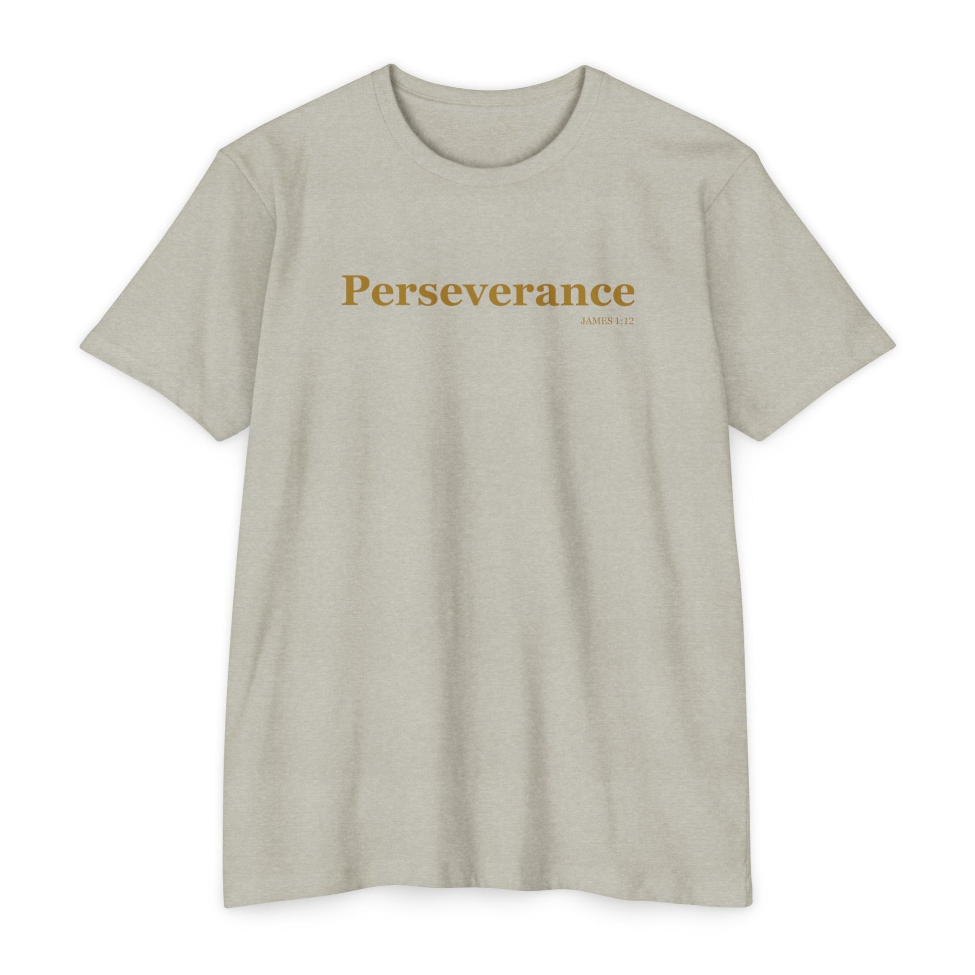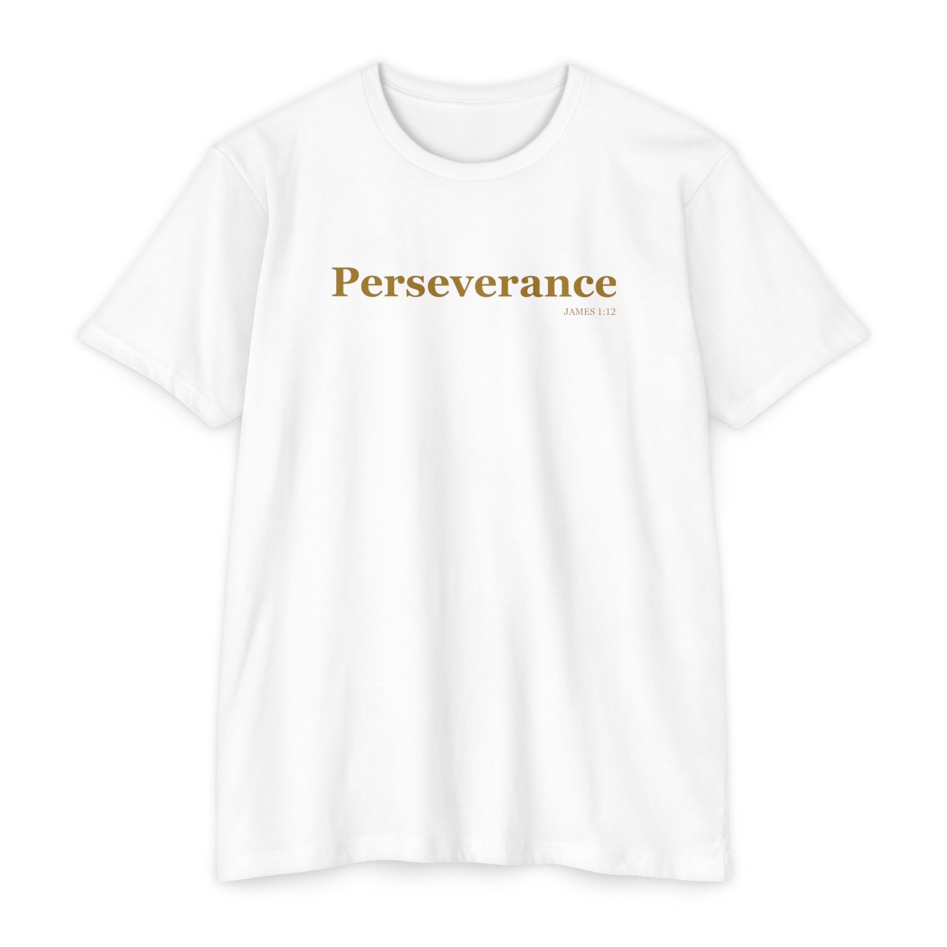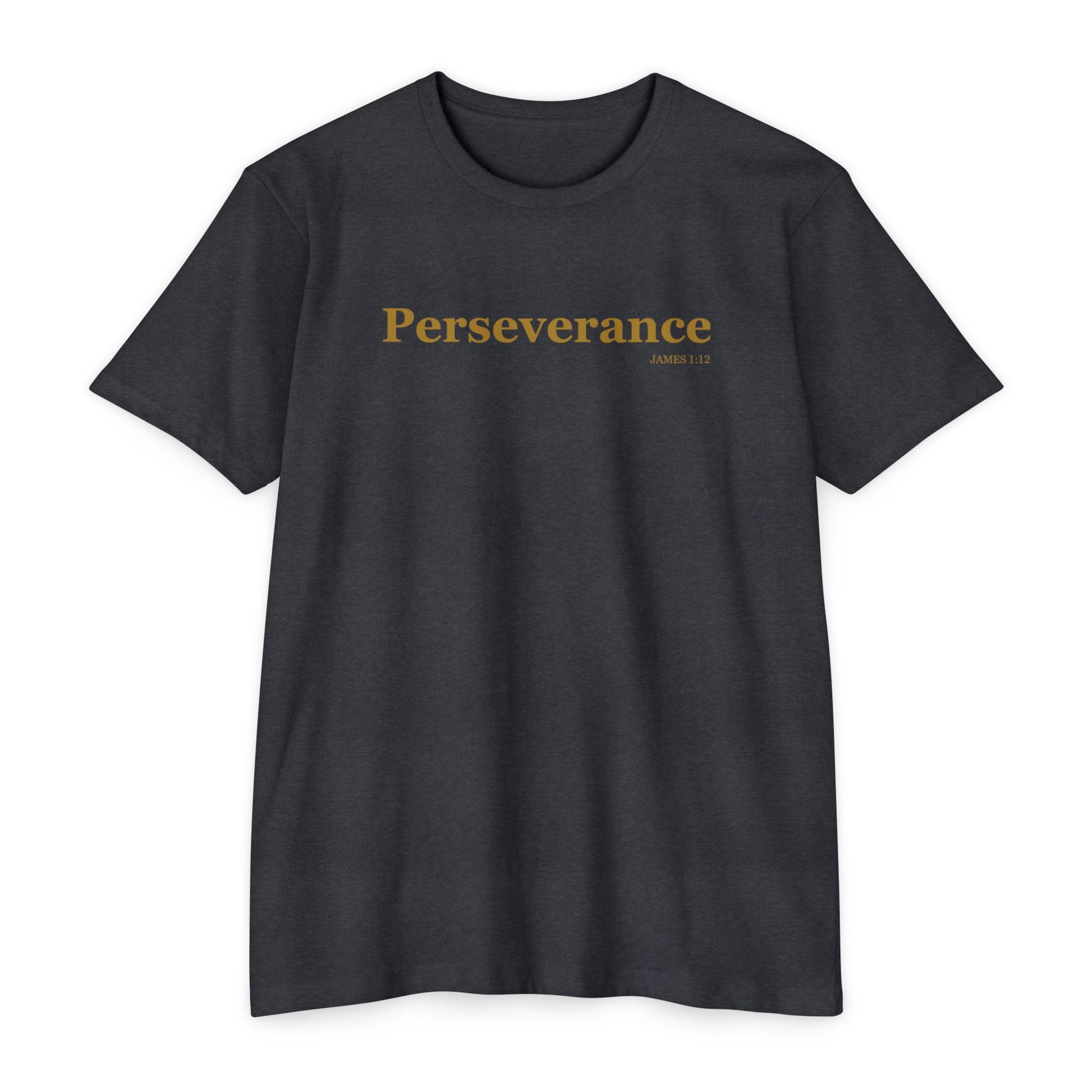 An inspirational T-shirt with the message 'James 1:12' promoting perseverance. This shirt gives off a positive and motivational vibe, making it perfect for those seeking encouragement and strength in their daily lives. Ideal for believers and individuals looking for a reminder to stay strong and resilient.