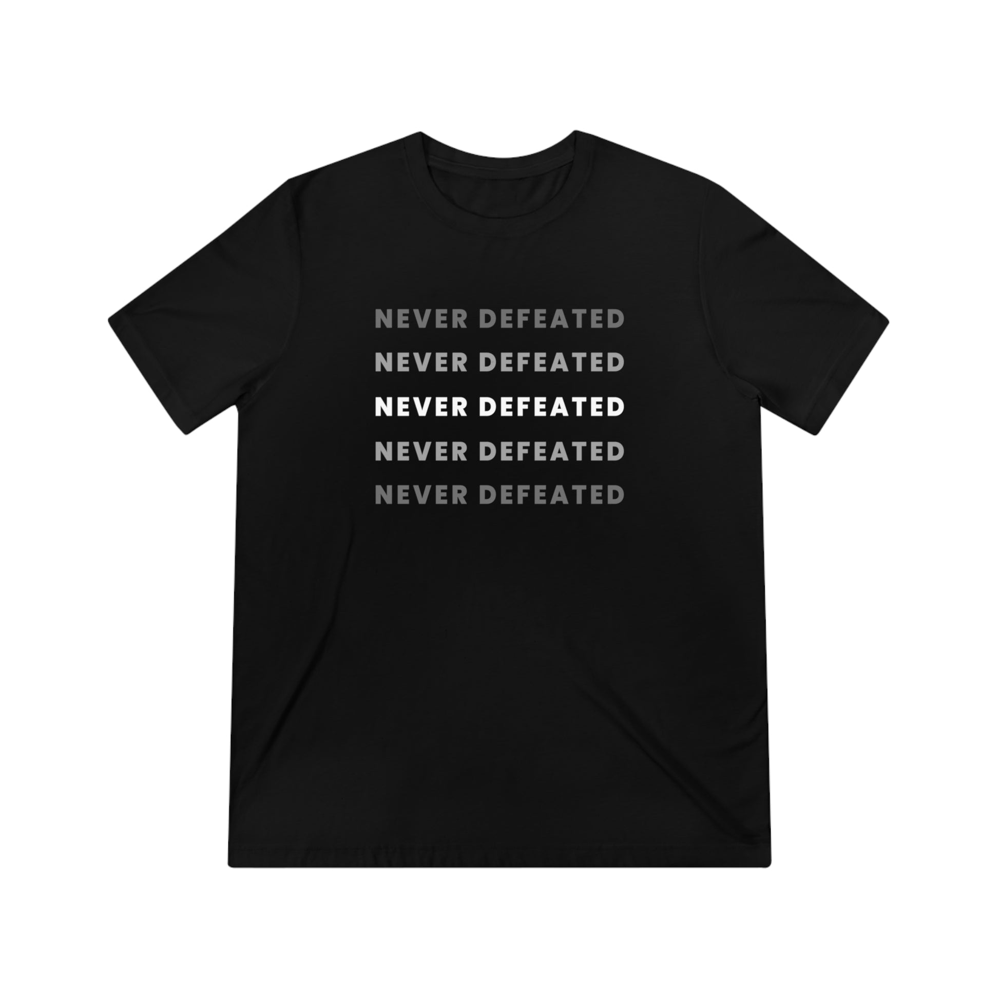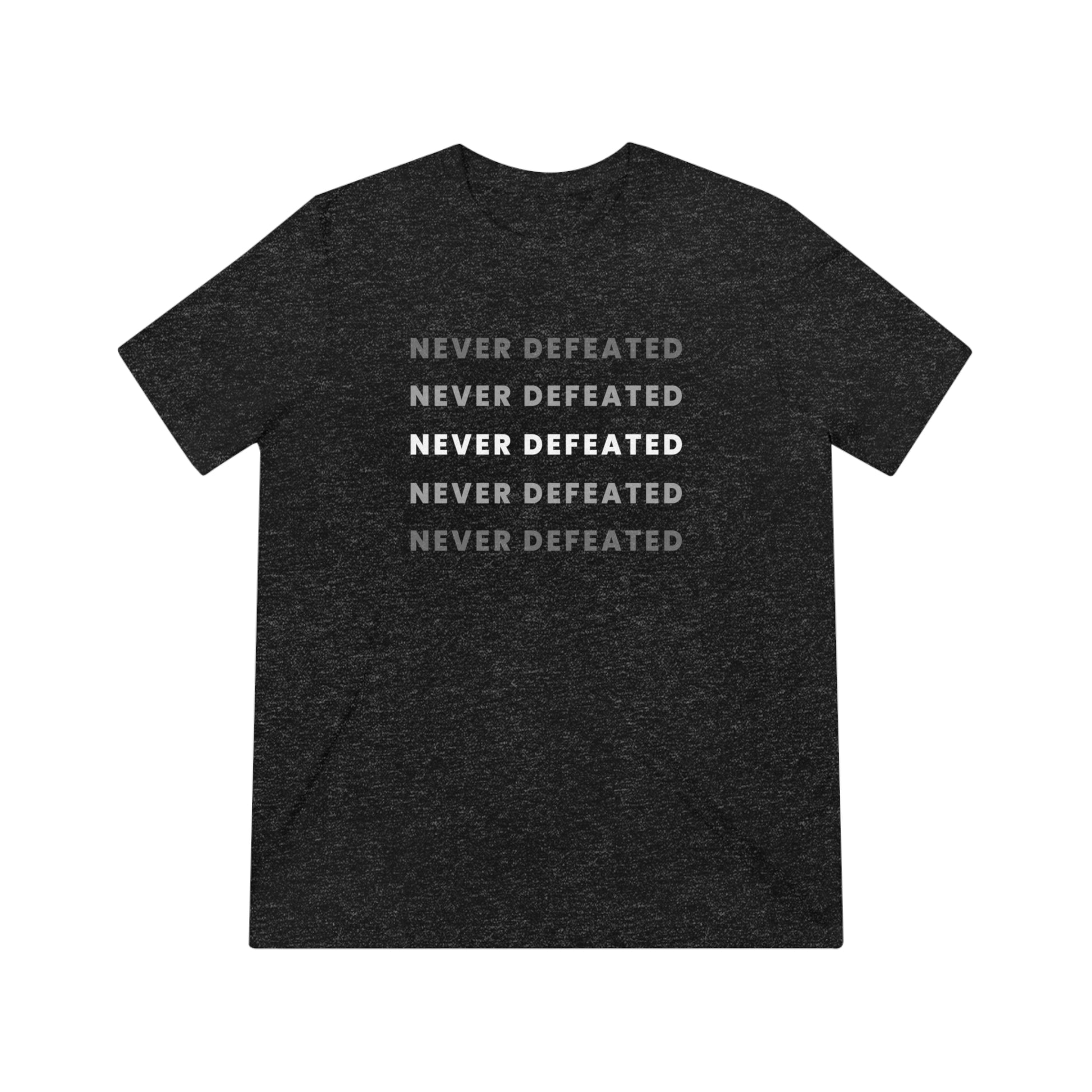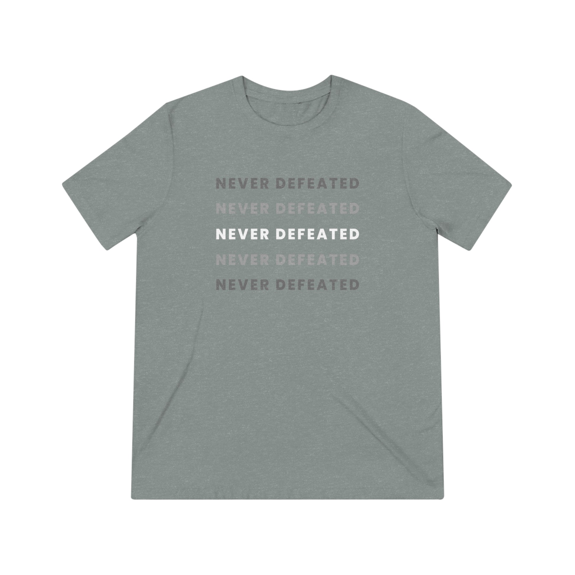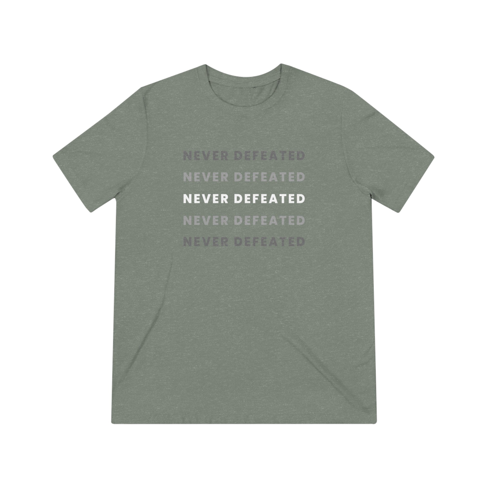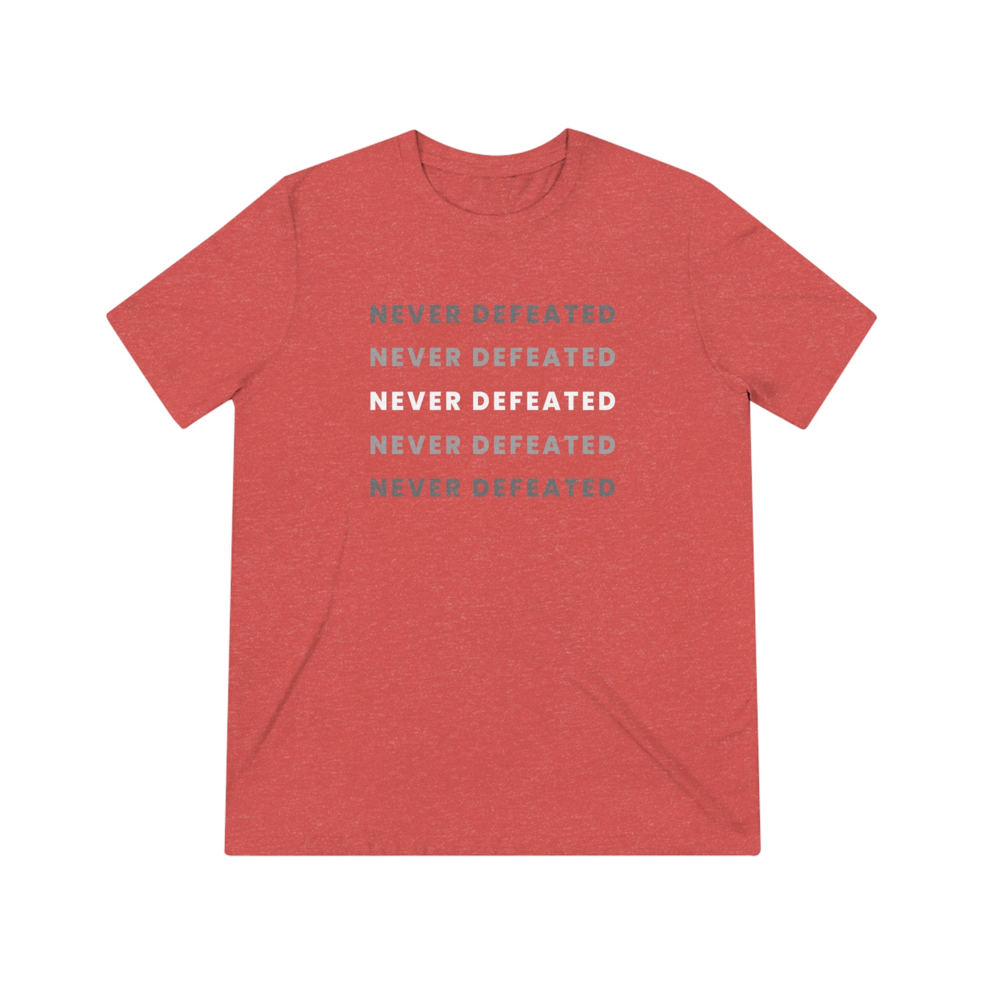 Elevate your faith-inspired wardrobe with our 'Never Defeated' unisex jersey short sleeve tee. Crafted with care and quality in mind, this classic tee fits like a well-loved favorite, making users fall in love with it over and over again. Made with 100% Airlume combed and ring-spun cotton, this lightweight fabric (4.2 oz/yd²) is perfect for layering and offers breathability, making it ideal for both active and leisure wear. The ribbed knit collars and tapered shoulders ensure a better fit over time, while the dual side seams hold the garment's shape for longer. Designed for casual and semi-formal settings, the retail fit and crew neckline add a classic, neat style that's perfect for accessorizing. Plus, the tear-away label minimizes skin irritations for added comfort. Available in a variety of fabric blends and colors, there's a perfect option for everyone. Embrace the spirit of resilience and showcase your faith boldly with our 'Never Defeated' tee!