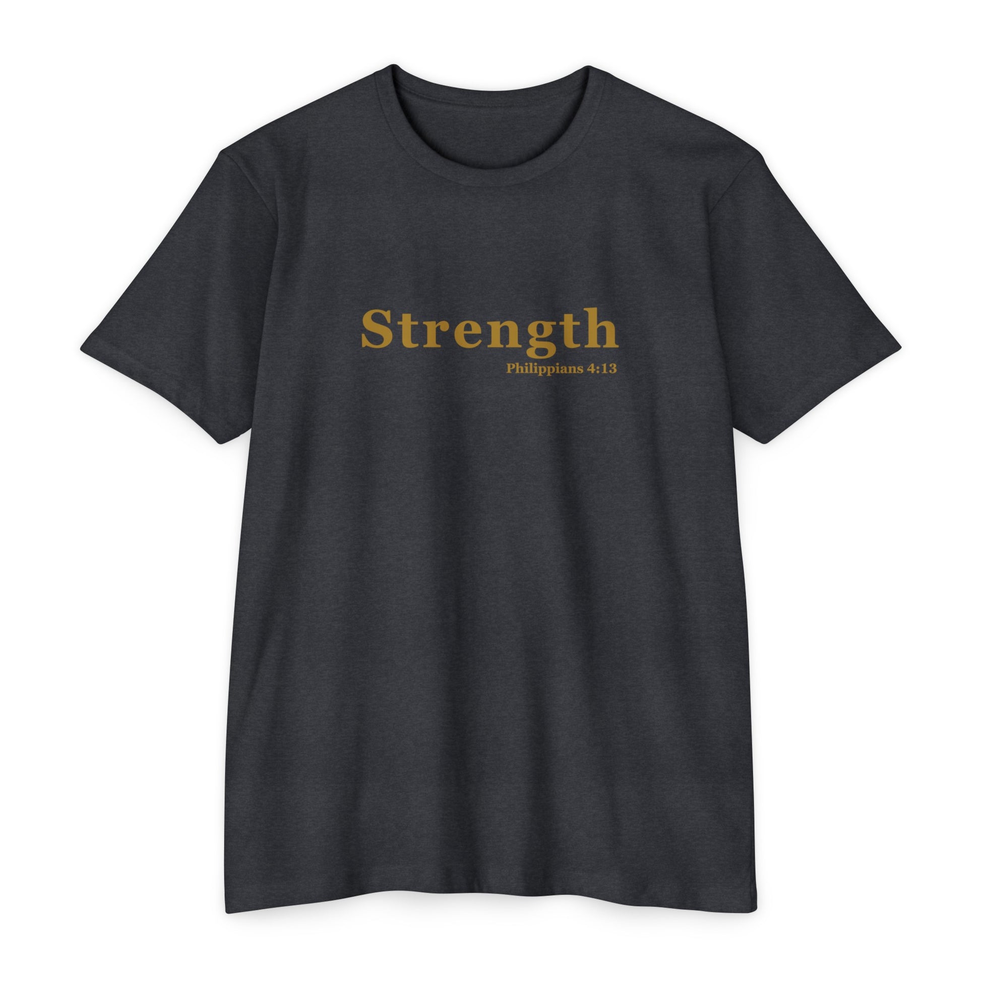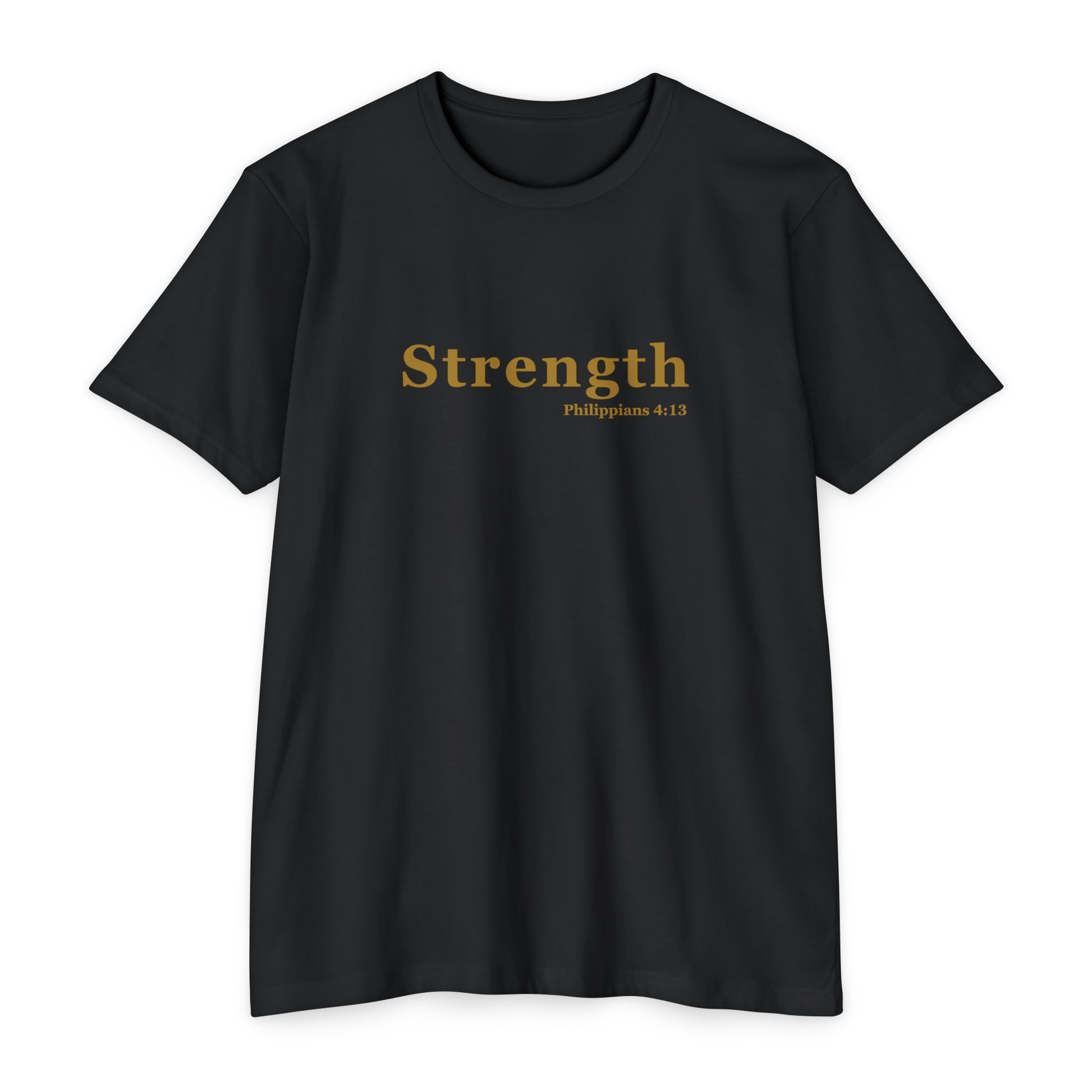 Find strength in every situation with our Forged by Faith "Strength - Philippians 4:13" T-Shirt. Featuring the empowering verse from Philippians 4:13 in bold gold letters on a classic black tee, this shirt is a powerful reminder that you can do all things through Christ who strengthens you.